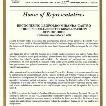 This experience was recognized in the Congressional Record (12/21/2022) by US House of Representatives Hon. Jenniffer Gonzalez-Colon.